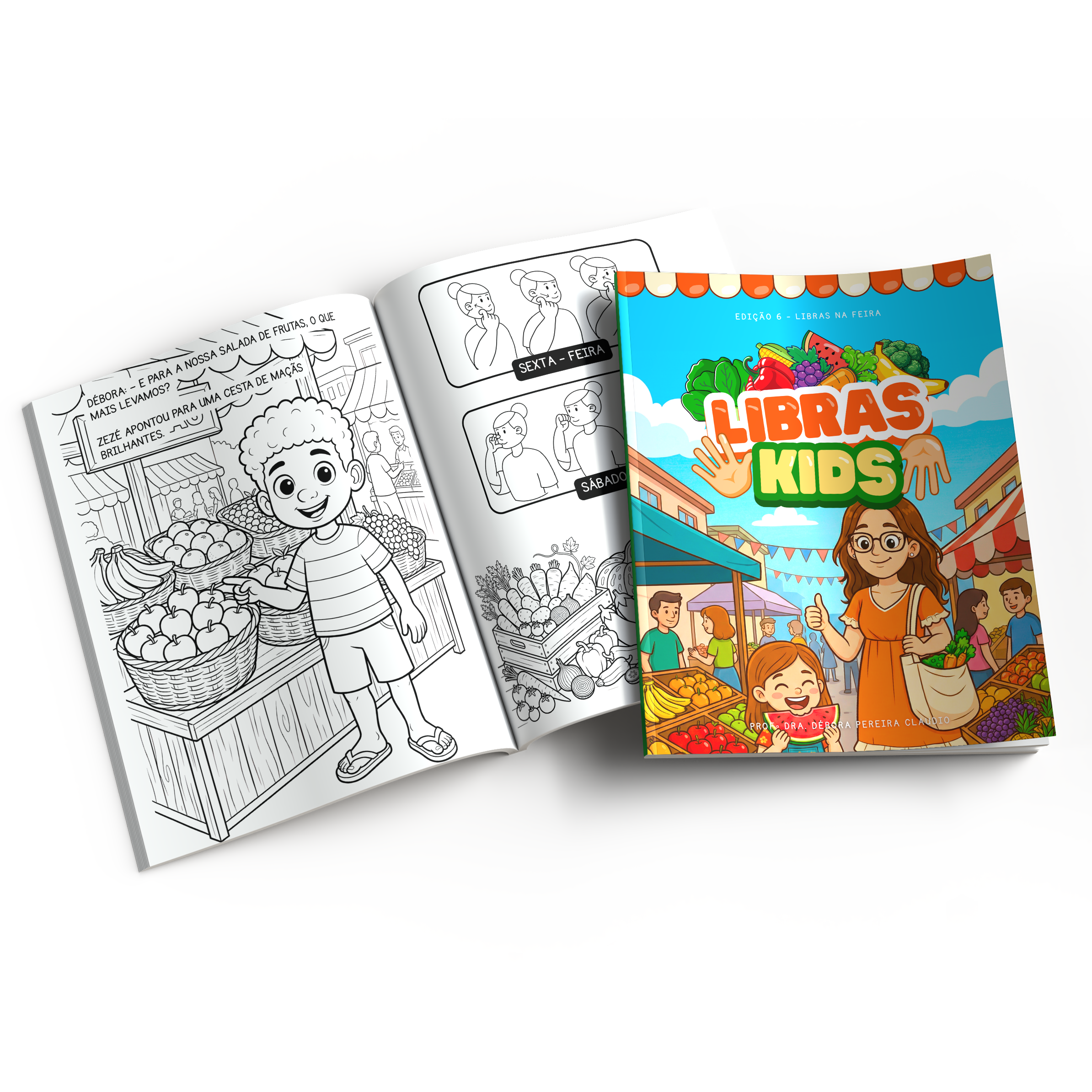 Libras Kids é uma revista física pensada para crianças, com o objetivo de apresentar a Libras de forma leve, divertida e inclusiva. Nessa edição 06 a turminha vai aprender Libras durante um passeio na feira. Desenvolvida para ser usada em casa, na escola ou em projetos educativos, a revista traz histórias ilustradas, músicas infantis com QR Code para aprender os sinais, personagens encantadores e atividades que estimulam o aprendizado natural da língua de sinais.